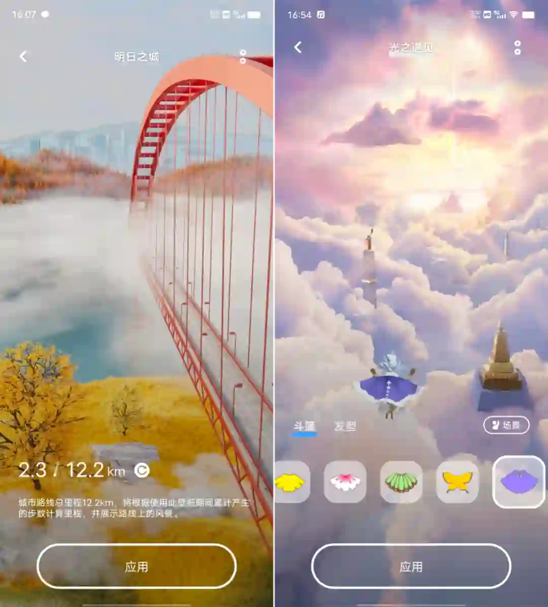 和去年那套花园漫步系列类似,新增的明日之城、光之遇见系列依然需要我们用现实生活中的运动步数来进行「养成」,前者能够做到百步一景,让我们一步步解锁云雾之下的重庆风貌,后者则与《光遇》深度合作,将游戏中的绝美景色直接搬到桌面和锁屏,同时还支持角色换装和局域网伙伴同行,俨然一个精简版的《光遇》游戏了。