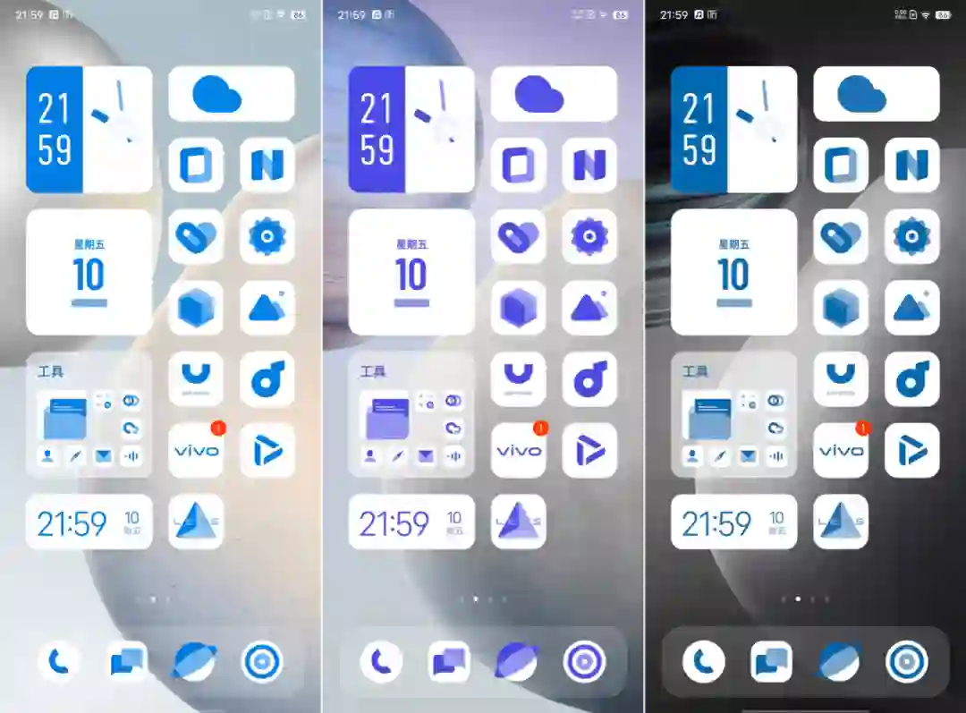最后,对更喜欢张扬个性、表达自我的年轻用户而言,千篇一律、秩序感这些关键词或许从来都不会是正确答案,很多朋友喜欢 Android 也正是因为其高度的定制性。OriginOS Ocean 的变形器依然为这部分用户提供了通道:图标大小支持三级调节,图标风格支持在精美与简约间自由转换,既可以和 Android 12 原生系统一样从壁纸中取色,也可以切换三种不同的系统主题……