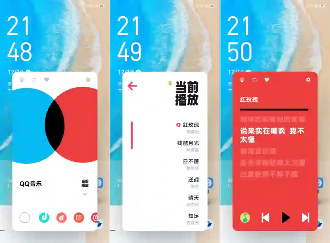 。除了 vivo 的 i 音乐应用,原子随身听同时兼容了 QQ 音乐、网易云音乐、喜马拉雅等主流媒体播放 App,并且可以根据实际使用对象在锁屏页面中集成快速切换、切歌甚至是看歌词等功能,将原本需要进入 App 内才能进行的操作,简化到了只需在锁屏就能完成,也打破了原子组件最初仅限桌面使用的限制。