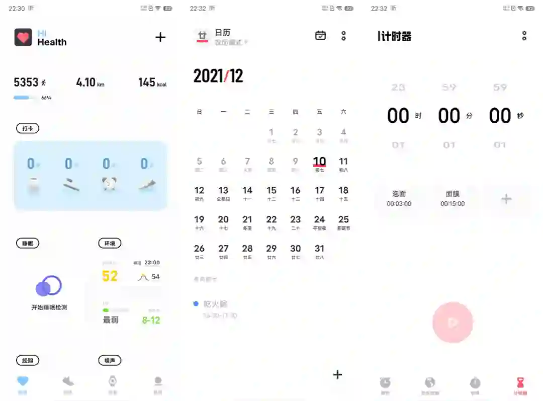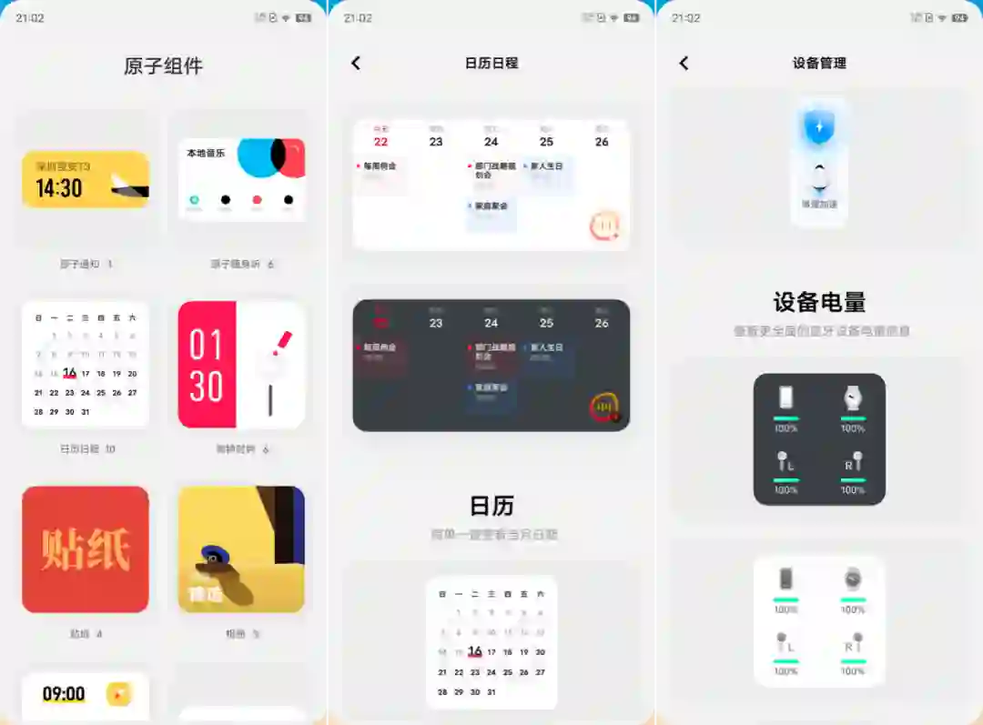 除了原子阅读和原子笔记,vivo 将其他的很多原生 App 都进行了优化和重设计,例如健康中心、日历、时钟,任选其一都可以说是真正「小而美」的 App,它们既能在系统整体的设计框架下提供层次分明的数据呈现(比如通过精美的桌面原子组件展示关键信息),又能在各自服务的领域中提供必要的功能支撑。最重要的是所有工具类应用均没有广告和营销内容的干扰,这一点可以说是难能可贵。
