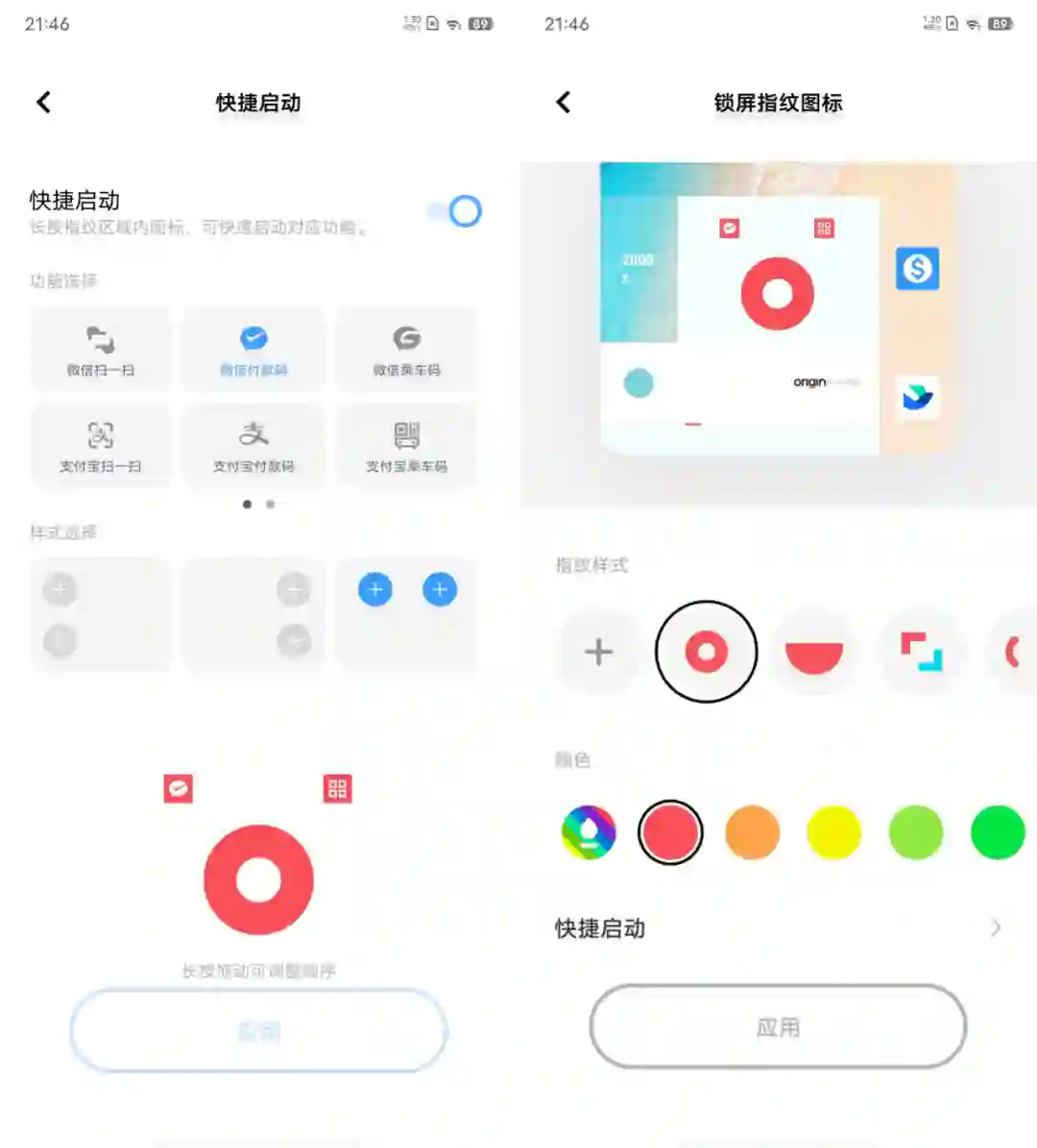 ,我们可以在「设置 > 桌面、锁屏与壁纸 > 锁屏设置 > Origin 锁屏自定义 > 锁屏指纹图标 > 快捷启动」进行设置,可以在指纹识别区域添加微信扫一扫、微信付款码、微信乘车码、支付宝扫一扫、支付宝付款码、支付宝乘车码和防疫健康码,都是当前大家在日常生活中需要高频用到的功能。