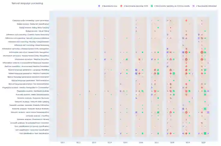 上图是NLP的基准生命周期展示,可以清晰看出,大多数任务的几个主流基准是在2011~2015年间建立的,这期间,也只有少数几个SOTA出现。2016年之后,新基准的建立速度大大加快,在翻译和自然语言建模方面表现最为突出;2018和2019年,分别都针对各种任务建立了大量的基准;2020年是个转折点,新基准的建立减少,方向转向推理或推理相关的高级任务上。