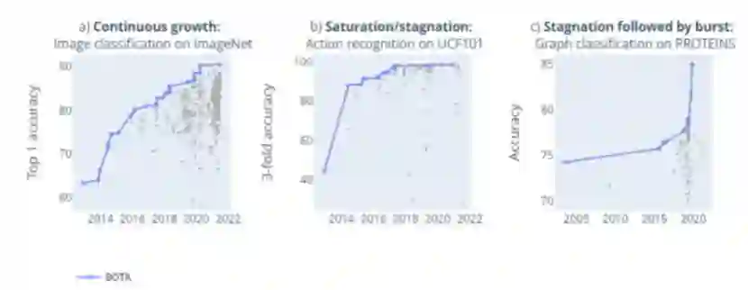 从单个基准出发,如上图可以看出基准上的SOTA有三种状态:稳定增长,停滞或饱和,以及停滞后的飞跃。其中,稳定增长代表技术稳定;停滞背后代表缺乏技术进步的能力;而爆发是指技术出现突破。