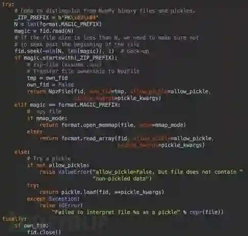 我们以ubuntu最新版pip源下载的numpy 1.16.0版本为例进行分析。漏洞点位于npyio.py的第268行,file字符串对象经过格式验证,如果不满足默认的numpy以及zip格式,将会尝试使用序列化的方式进行读取文件。如果是老司机的话,估计大概知道是什么问题了。