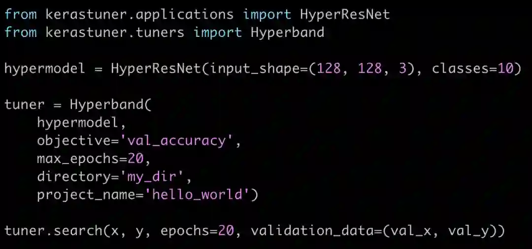 除了允许您定义自己的可调参模型,Keras Tuner 还提供两个内置可调参模型:HyperResnet 和 HyperXception。这两个模型会分别搜索 ResNet 和 Xception 架构的各种排列,也可和Tuner配合使用,比如: