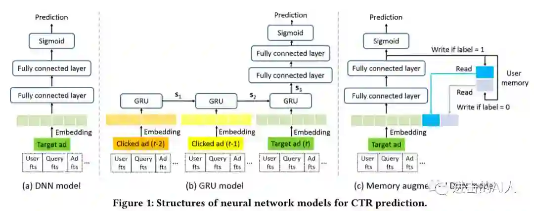 其实一个推荐系统要做到记忆用户行为,根据其历史行为做出更好的推荐,是有很多环节或者说方法要考虑的。比如 session、id mapping、模型等等多个方面。模型而言,大家熟知的 RNN,LSTM,GRU等等都是比较流行的基础算法。上述模型的缺点也很明显,就是对输入数据要求高、计算复杂度高、在线性能开销大。阿里和百度都有一些工作来解决这个问题,从而能够在线上使用具有记忆能力的模型。今天介绍的是阿里工作:Click-Through Rate Prediction with the User Memory Network。文章的主角就是 memory augmented DNN (MA-DNN)。