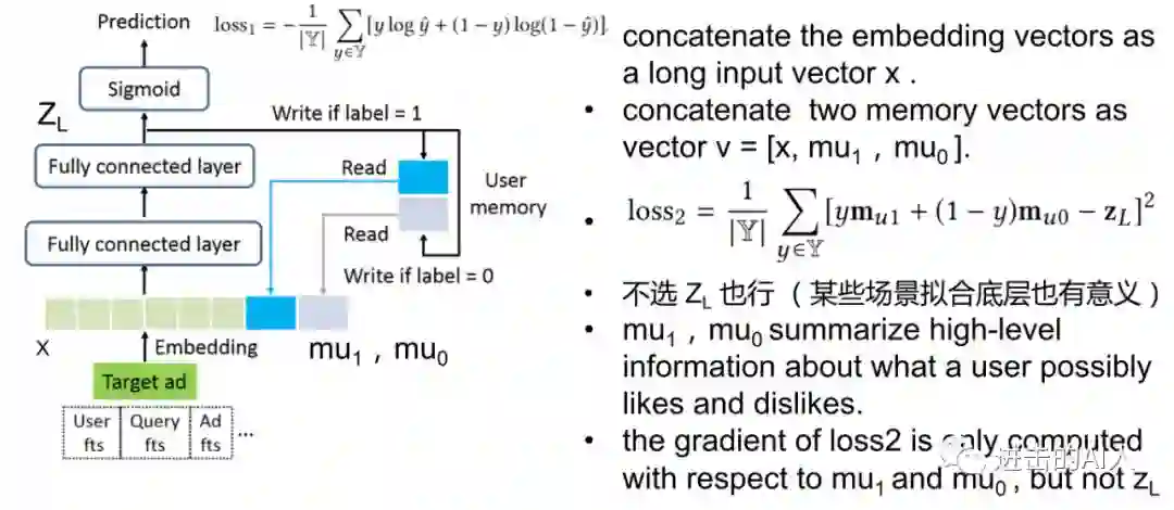模型训练的时候,和预估类似,也是查询 userid 的mu1/mu0后进行前向计算得到 loss1和 loss2。然后 loss1 和 loss2分别进行反向传播更新各自的参数。这里要注意,loss1不影响 mu1/mu0的更新,loss2也不影响左侧 FC layer 的参数更新。loss1就是点击率模型常用的 cross-entropy,loss2则是 mu1/mu0分别拟合 ZL 的结果。当 ins 的 label 是0时,则只和 mu0有关,ins 的 label 是1时,则只和 mu1有关。所以mu1/mu0两个向量特征分别刻画着 click/non-click 或者说 like/dislike 的语义。MA-DNN 就是利用这样一个简单的结构来实现对 userid 维度进行历史行为的记忆。