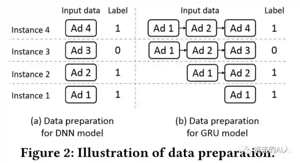 图1-b 中则是一个典型的 GRU 时序模型,具有记忆能力,但是对训练数据的要求很高如图2-b 所示。需要将用户的点击序列提前处理好后再输入给模型。