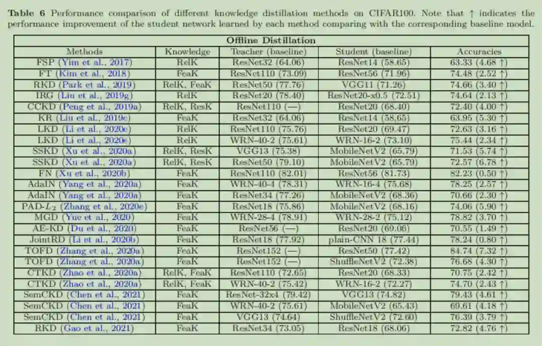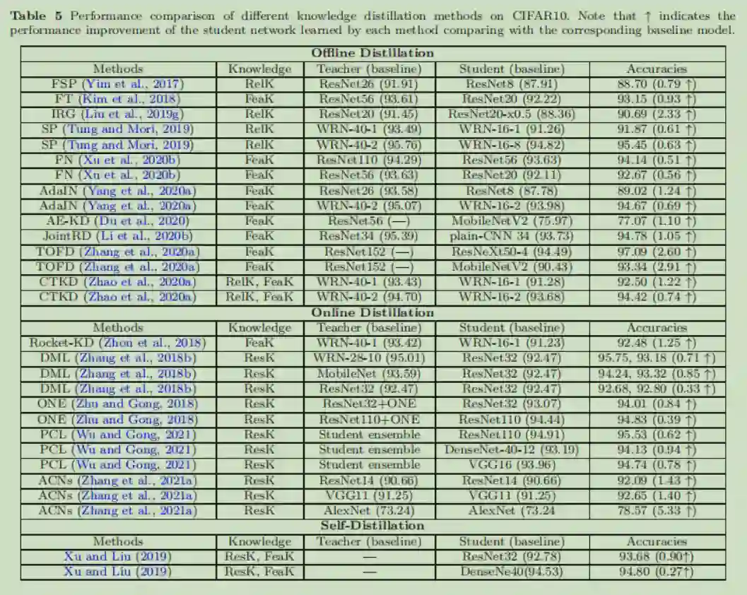 比较了知识蒸馏方法在 CIFAR-10,CIFAR-100 上的准确率提升: