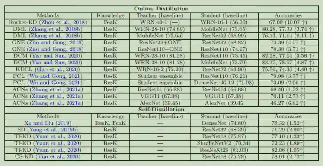 模仿人类学习的过程,知识蒸馏逐渐发展出:teacher-student learning(普通的知识蒸馏过程。训练完的教师神经网络指导学生神经网络的训练)、mutual learning(互相学习,在多教师或者多学生知识蒸馏过程中有体现,相当于一种模型集成方法)、assistant teachering,lifelong learning,self-learning(教师和学生模型是同一个,也叫 self-distillation,自蒸馏)