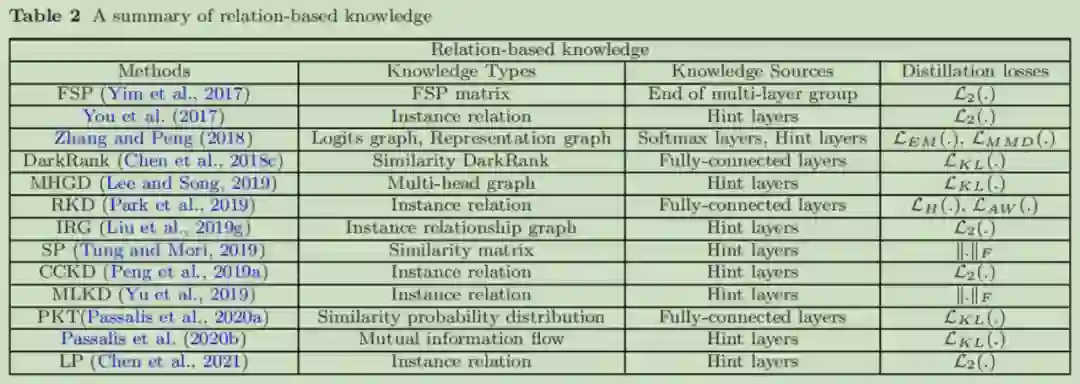 这个表中,第一列是中间层知识蒸馏方法名,第二列是那种中间层知识进行蒸馏,第三列是知识的来源,也就是网络中哪一层的输出,最后一列表明使用的衡量相似性的函数是什么。