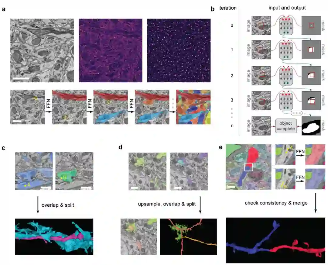 追踪大量电子显微镜数据中的神经突触是图像分割问题的一个实例。传统的算法将该过程至少分为两步:利用边缘检测器或机器学习分类器找到神经突触之间的边界,然后使用分水岭或图像分割等算法将未被边界分隔的图像像素组合在一起。2015 年,我们开始尝试一种基于循环神经网络的替代方法,将这两个步骤统一起来。该算法被嵌在特定的像素位置,然后使用循环卷积神经网络迭代地「填充」某一区域,该循环卷积神经网络用来预测哪些像素属于与种子相同的对象。自 2015 年以来,我们一直致力于将这种新方法应用于大规模的连接组学数据集,并严格量化其准确率。