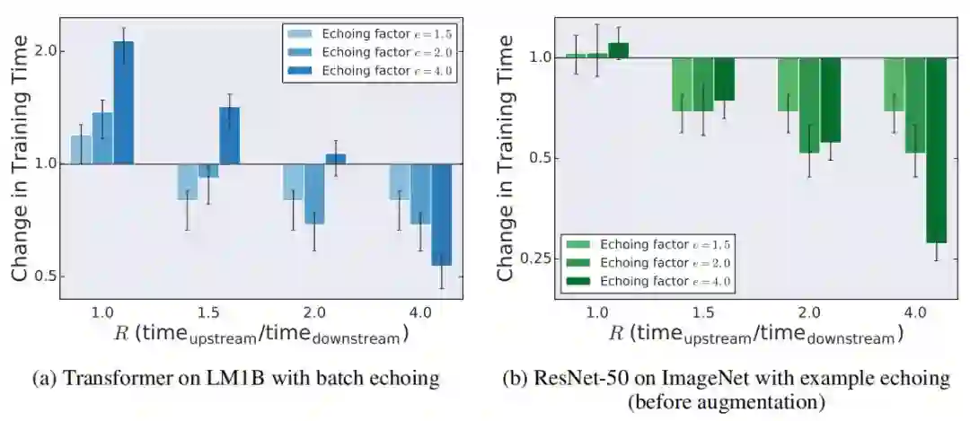 使用数据回送时,减少的训练时间取决于上游步骤和下游步骤之间的比重。一方面,由于重复数据的价值可能低于新鲜的数据,数据回送可能需要更多的下游 SGD 更新才能达到预期的表现。另一方面,每个下游步骤只需要 1/e(而不是 1)个上游步骤的时间。如果下游步骤增加的数量小于 e,上游步骤的总数(以及总训练时间)将减少。R 代表数据回送的最大可能加速,如果 e=R,并且重复数据和新数据价值相同,则可以实现最大加速。