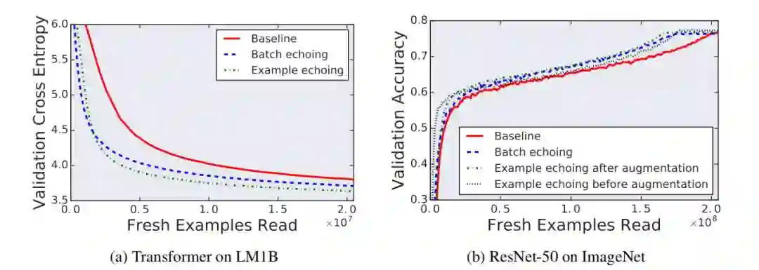 尽管人们可能担心重复使用数据可能会损害最终的表现性能,但实验中没有观察到任何类似情况。为了进一步证明数据回送不会降低解决方案的质量,作者在 LM1B 上使用 Transformer 进行了实验,在 ImageNet 上使用 Resnet-50 进行了实验,在固定新样本数量下找到最佳可实现性能。图 8 显示了在每个实验的训练过程中,数据回送在任何一点上都达到了最佳的性能。所有的数据回送变体都至少实现了与两个任务的基线相同的性能。