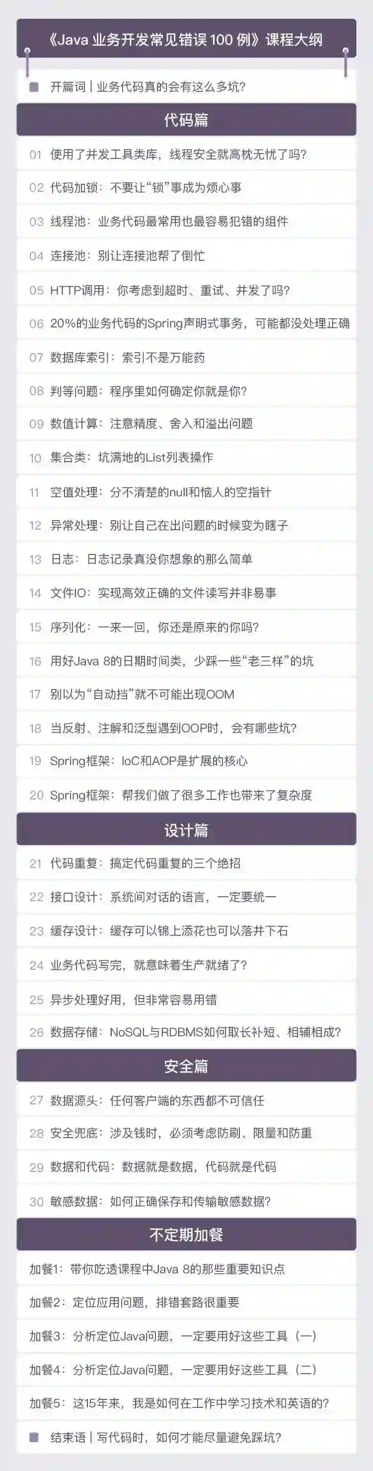 在专栏里,我从接触过的 200+ 真实的生产事件和事故中,整理提炼了 100 个 Demo,涉及 130 个坑点和 50 个最佳实践,结合 Java 代码演示,帮你掌握规避高频坑点的方法,真正提升自己的技术能力。同时,你也可以把专栏当作代码审核的 Checklist,上线有备无患。