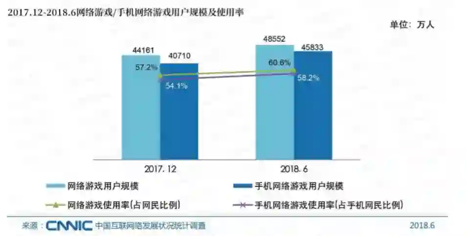 在《报告》中,网络游戏是被重点提及的一部分。截至2018年6月,我国手机网络游戏用户达到4.58亿,较去年末增长5123万人,占手机网民的58.2%。