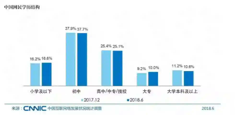 可以说,拼多多和趣头条的出现,证明了如今的互联网,已经不再是二十年前的精英玩具。这点在《报告》的数据中体现得十分明显:截至2018年6月,我国10岁到19岁的网民占比18.2%,但可能很多人想不到,中国网民中学生群体最多,占比达24.8%。从整体情况看,初中、高中/中专/技校学历的网民占比62.8%。其中,初中学历网民占比为37.7%。
