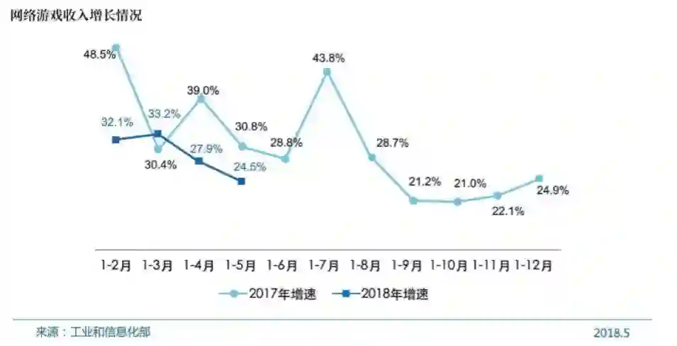 游戏是许多公司变现的主要方式,《报告》显示,今年1月到5月,网络游戏业务收入共743亿元,同比增长24.5%。