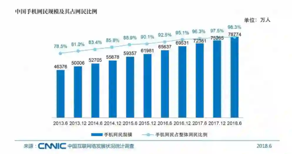 《报告》显示,截至2018年6月,我国手机网民规模达7.88亿,较2017年末增加4.7%,网民使用手机上网的比例达98.3%,较2017年末提升了0.8个百分点。而在2012年底,我国手机网民规模仅有4.2亿,在整体网民中占比74.5%。