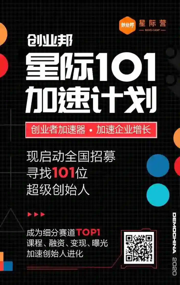 为了能够更好的与创业者们共渡时艰,创业邦已全面启动2020年度「星际101加速计划」,将已开设18期、培育744优秀项目的星际营升级为Demo China唯一指定项目入选通道,从资本加速、资源对接、势能提升、学习成长四个维度为“0-A+”阶段创始人打造的创业加速特训体系。