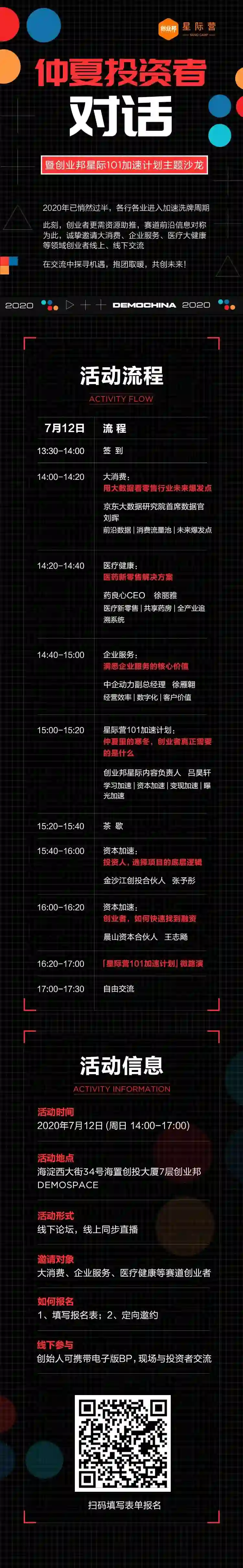 7月12日,创业邦将举办《仲夏投资者对话-暨星际营101加速计划主题沙龙》活动。目的:对称行业赛道前沿信息、赛道标杆创业者分享、路演环节让创业者找准下半年融资节奏及融资演练。另外,北京线下活动将接触更多创始人,进行资源互换,合作与交流。
