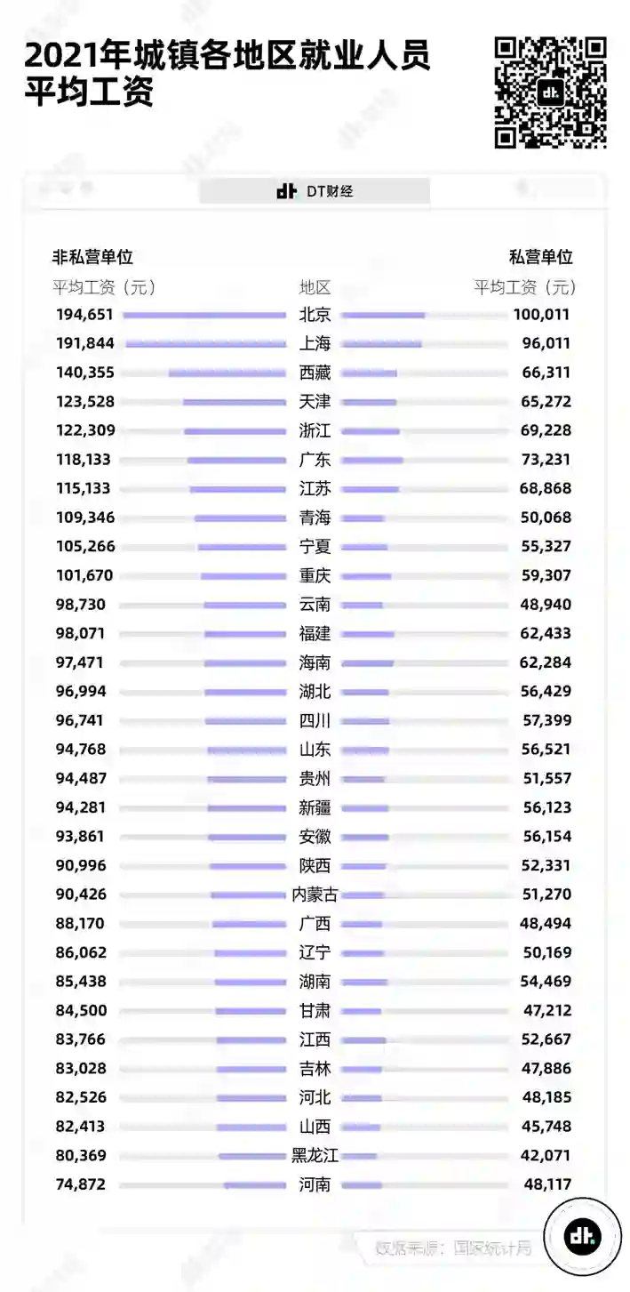 从各省市的年平均工资来看,北京和上海遥遥领先。2021年北京非私营单位的年平均工资最高,达到了19.47万元,上海排名第二,年平均工资达到了19.18万元。西藏、天津、浙江、广东、江苏、青海和重庆这7个省市,年平均工资也超过了10万元的大关。
