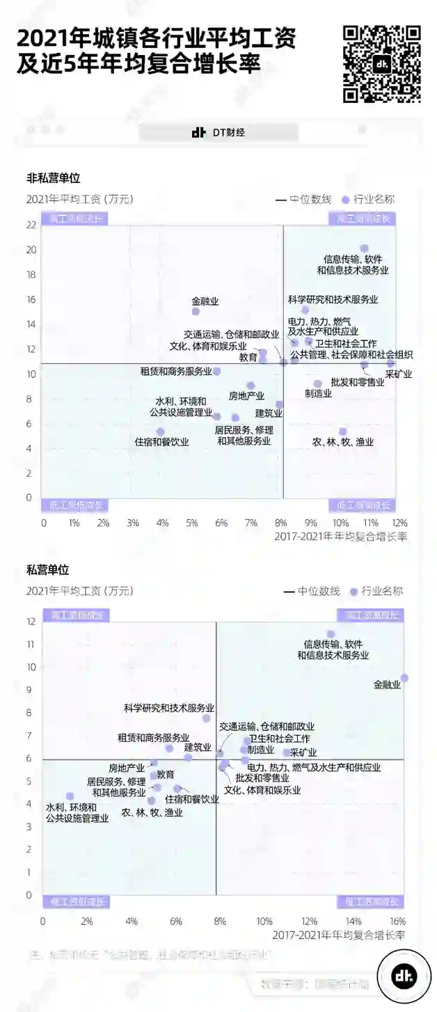 DT君计算了各行业2017-2021年年均工资的年均复合增长率,并把各行业的年平均工资和复合增长率放置在散点图上,并以中位数作为分割线,切出四个象限。