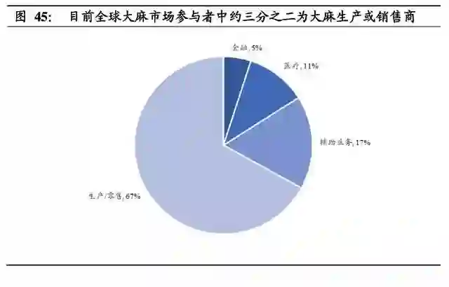 在全球大麻参与者中,约有三分之二的公司为直接进行大麻生产或销售,随着全球大麻合法化进程的推进,从事医疗、金融市场和消费品及服务类公司有望比种植和销售大麻的公司更快获得收益。