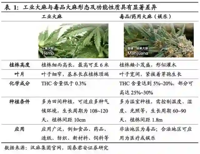 工业大麻、药用/毒品大麻、中间型大麻形态及功能性质具有显著差异。