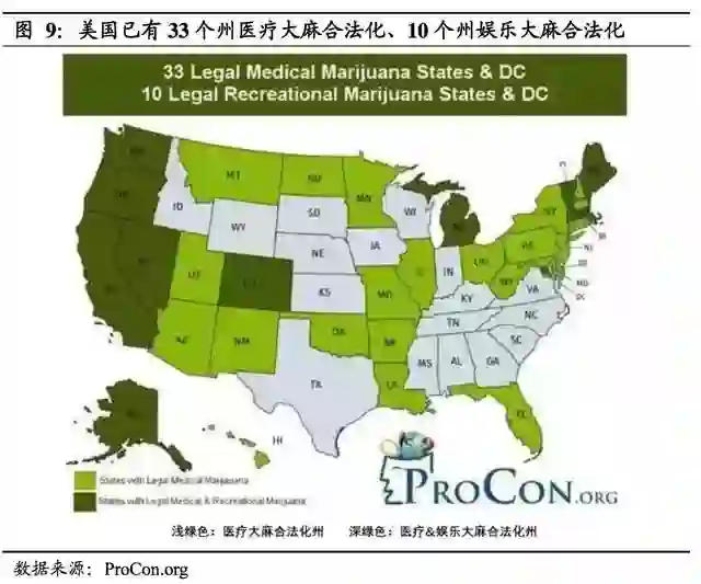 美国目前已有33个和10个州医疗和娱乐大麻合法化,2018年工业大麻全面合法,加拿大于2018年10月娱乐大麻合法化。