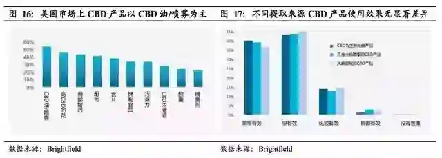 医用大麻有望助于缓解阿片类药物滥用风险。美国医用大麻使用者多数认为CBD治疗有效,且不同提取来源的CBD产品效果无显著差异。美国市场CBD产品以CBD油/喷雾为主,CBD油分为广谱油和晶体油。
