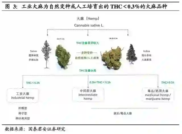 工业大麻为THC含量低于0.3%的大麻品种,大麻下游应用极为广泛。