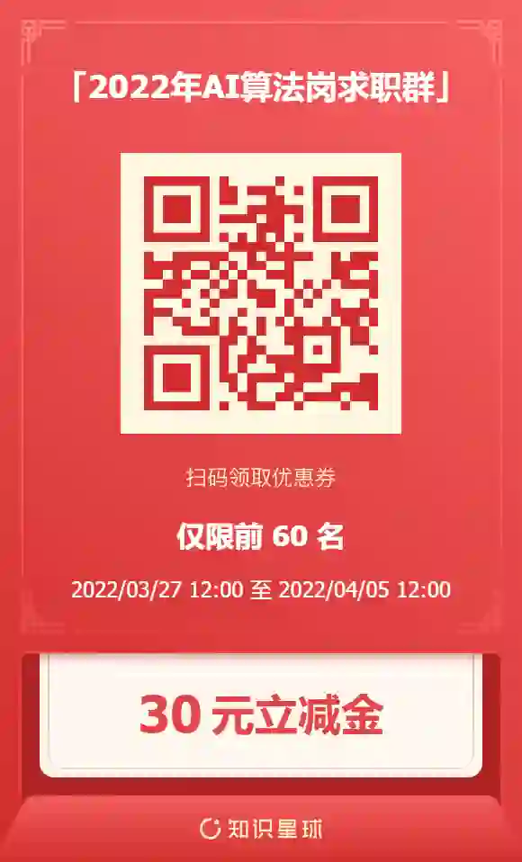CVer 在此赠送 60 张 AI算法岗求职群(知识星球)30元优惠券!今年最大的优惠力度!今年、明年和未来几年要找工作的同学们可以抢起来了~注:2022年是针对2022届、2023届,但星球一直不会变(24届及以后都会在里面),里面的内容永存!