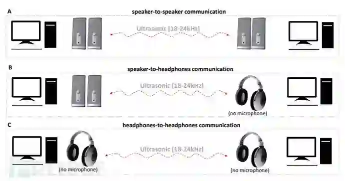 研究人员在这份标题为《Mosquito攻击:空气间隙计算机之间的隐蔽通信》的研究报告中解释称,这种攻击方法的隐蔽性非常高,它可以通过扬声器的超声波信号来发送和接收数据。这项技术可以将音频输出插孔转换成输入插孔,然后再将扬声器转换为麦克风。这是现代音频芯片组的一种功能,也可以说是一种特性,并且可以通过软件来实现转换。但是,攻击者也可以通过特殊制作的恶意软件来利用这种功能,然后将目标主机的扬声器或耳机转换成麦克风,并通过超声波信号完成两台计算机设备之间的数据提取(最远距离为9米左右)。