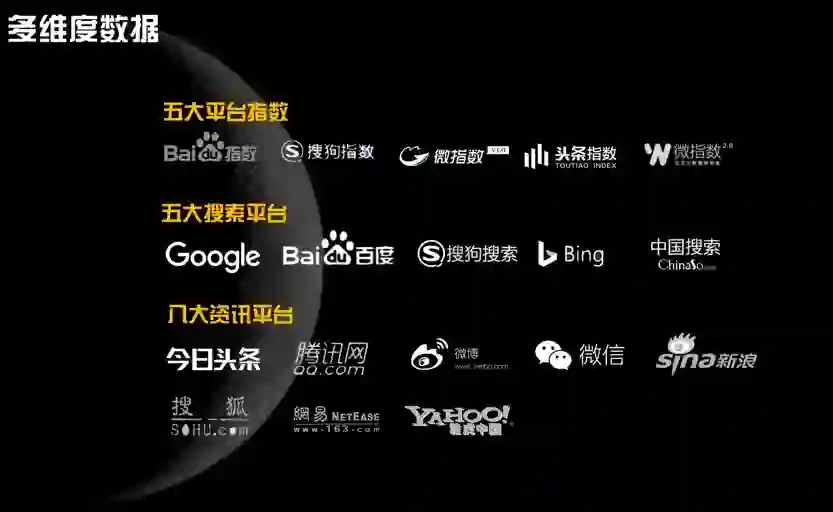 其中,搜索数据来自Google、百度、搜狗、必应和中国搜索这5大搜索平台,新闻数据则来自今日头条、腾讯网、微博、微信、新浪网、搜狐、网易和雅虎这8大资讯平台。