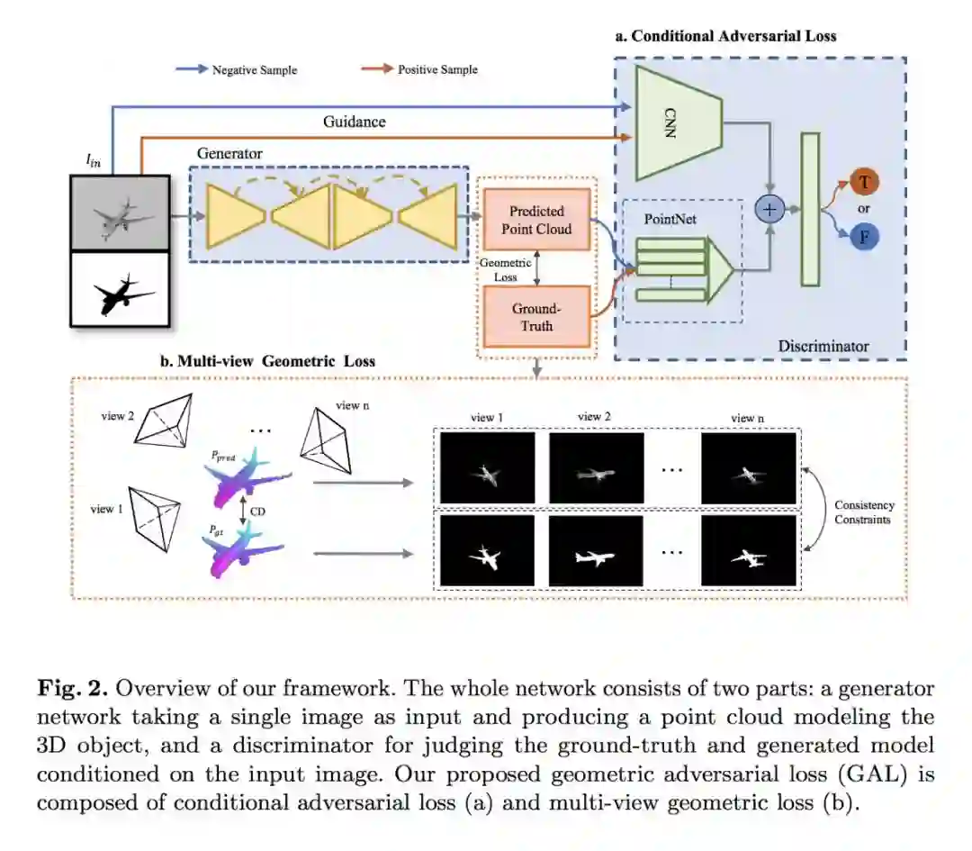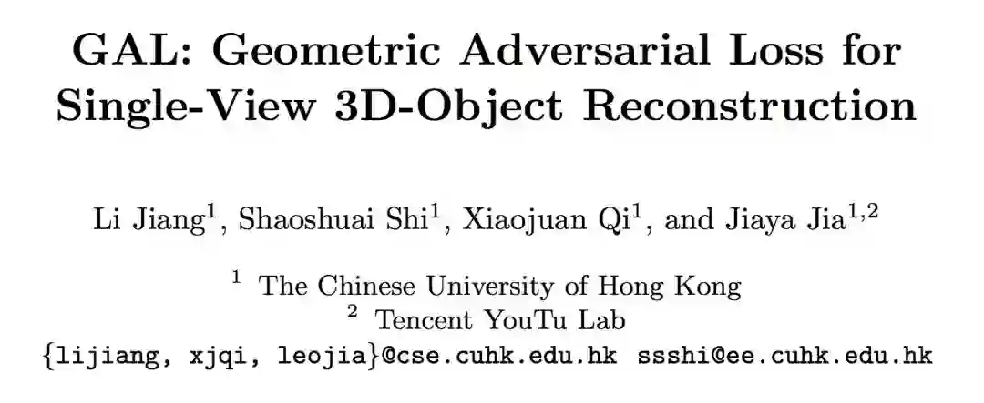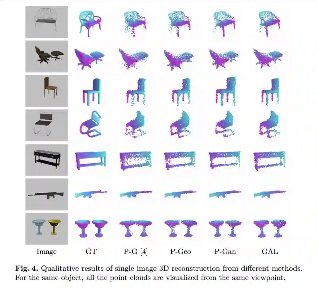 论文用 GAL 来刻画重建之后的模型损失,它由两个术语组成,其中几何损失确保从不同视点接近 Groundtruth 的重建 3D 模型的一致形状,条件对抗性损失生成具有语义意义的点云。