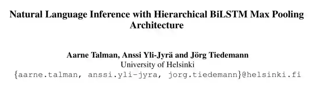 本文来自赫尔辛基大学,论文主要关注的是自然语言推理任务。作者利用多层双向 LSTM 进行句子编码,并用上一个 LSTM 的结果初始化下一个 LSTM,取得了较好的结果。此外,实验表明本文提出的句子嵌入方法可应用于各类迁移学习任务。