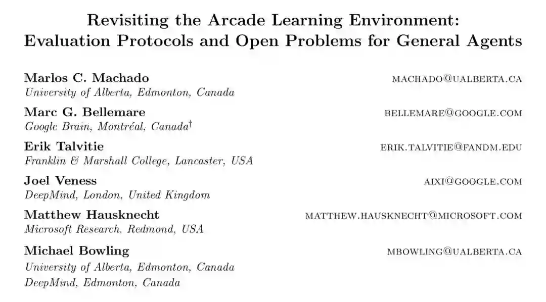 本文对 ALE (Arcade Learning Environment) 平台做了进一步深入介绍,主要从以下几点出发:1. 总结了关于 ALE 相关问题的经验,如:Frame skipping, Color averaging and frame pooling 等;2. 总结最新成果,以及当前待解决的一些问题 ;3. 新的 ALE 版本,介绍了新平台的特性,如:sticky actions, multiple game modes 等。