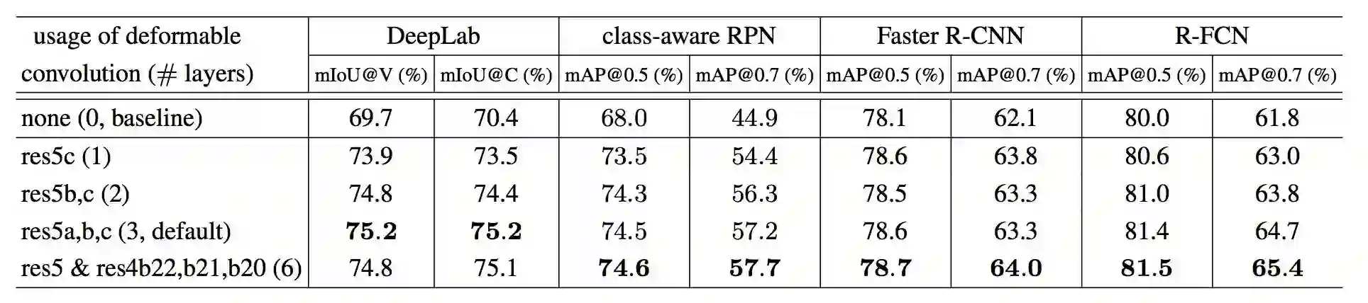 Table 1 在各种方法和各种数据集上,使用不同层数的可变形卷积对结果带来的影响,其中 DeepLab 在 VOC2012 与 Cityscapes 的训练集上进行训练,在验证集上进行测试,class-aware RPN, Faster R-CNN 与 R-FCN 在 VOC2007 与 VOC2012 的训练验证集上进行训练,在 VOC2007 的测试集上进行测试。