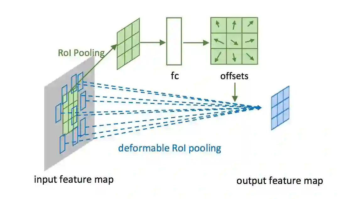 Figure 3 展示了可变形兴趣区域池化框架。首先通过标准的兴趣区域池化(绿色)获得兴趣区域对应的特征,该特征通过一个全连接层得到兴趣区域每个部位的位移量。用该位移作用在可变形兴趣区域池化(蓝色)上,以获得不局限于兴趣区域固定网格的特征
