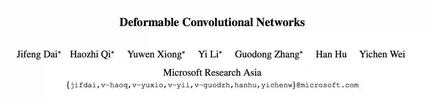 由于构造卷积神经网络 (CNN) 所用的模块中几何结构是固定的,其几何变换建模的能力本质上是有限的。在我们的工作中,我们引入了两种新的模块来提高卷积神经网络 (CNN) 对变换的建模能力,即可变形卷积 (deformable convolution) 和可变形兴趣区域池化 (deformable ROI pooling)。它们都是基于在模块中对空间采样的位置信息作进一步位移调整的想法,该位移可在目标任务中学习得到,并不需要额外的监督信号。新的模块可以很方便在现有的卷积神经网络 (CNN) 中取代它们的一般版本,并能很容易进行标准反向传播端到端的训练,从而得到可变形卷积网络 (deformable convolutional network)。大量的实验验证了我们的方法在目标检测和语义分割这些复杂视觉任务上的有效性。代码将会公布。