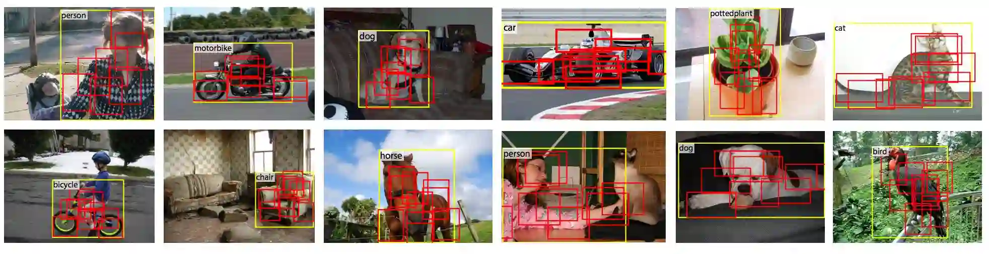 Figure 6 对可变形兴趣区域池化的效果进行可视化,使用了 R-FCN,兴趣区域网格大小为 3x3,可以发现现在池化区域基本覆盖在物体上。