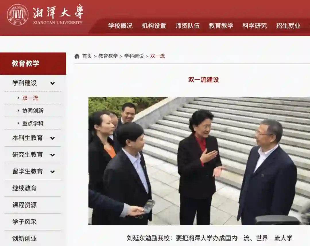 而在湘潭大学官网的介绍中,一直在学科建设栏目中,设有“双一流建设”页面。创办于1958年的湘潭大学,是一代伟人毛泽东同志亲自倡办的综合性全国重点大学。办学60余年来,学校数学与计算科学及相关学科人才培养质量全国领先,在全国数学界特别是计算数学界享有声誉,被誉为“计算湘军”。学校培养出了袁亚湘、周向宇、欧进萍等院士,还涌现了发现微软操作系统十大漏洞并引起微软总部震惊的刘蝶雨等学术人才,湘潭大学的人才培养质量可谓十分优质。