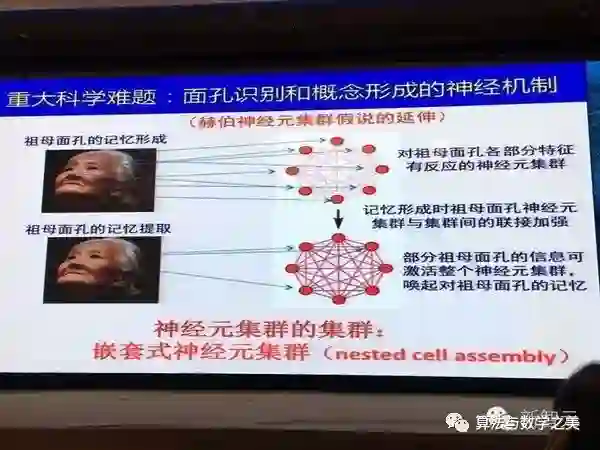 简单的细胞群假说可以进一步扩充,我们每一个人都记得祖母的面孔,因为它的特征都在我们的大脑里面,所以细胞群建立之后,我们现在只要看到部分信息,比如看到祖母的眼睛,就能完全回忆起整个面孔。每一个细胞群相互之间可以建立一个超级细胞群,这个概念叫做细胞集群的集群,是一种嵌套的、可以编码、更复杂的感知信息、感知记忆。我们对祖母还有一个概念,我们记得她的面孔,对祖母还有各式各样的印象,包括名字、故事、穿的衣服,每一个都是一个超级细胞群,这些细胞群连在一起,因为祖母不断出现,超级细胞群之间也是同步激活,建立祖母的概念,整个概念就是一个祖母的概念。