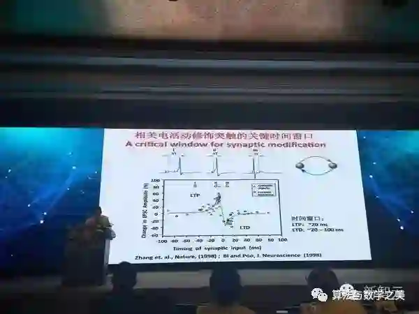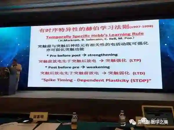 赫伯的假说有一个转折,就像刚刚讲的人工智能发展一样,每隔一段时间就有一个转折,这个转折就说原来赫伯假说里面的学习法则,什么都是同步,两个放电顺序是怎样,时间是怎样,没有描述,所以在很多实验,包括实验室的实验,说明有赫伯学习假说应该修正,修正成为一个时序的假说,突触前跟突触后的神经元的先后,就是突触前要是比突触后先有电活动就是强化,就是LTP,假如反过来就是LTD,所以STDP就是这么来的。