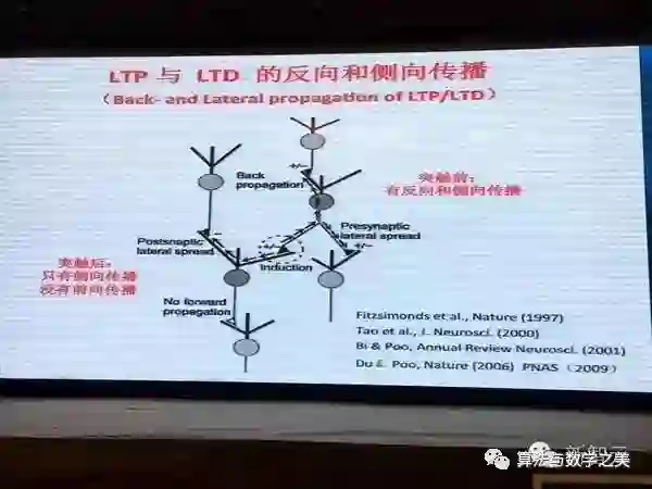 这个文章创了两个记录,第一个就是Nature长文,有10页纸长,另外一个记录就是这篇文章是引用率较低的文章,这为什么呢?我们做这个实验,没有人知道为什么做这个神经,神经科学的人看到这个,他不知道这个结果有什么用,人工智能不读生物科学的文章,所以引用率是较低的。到今年现在慢慢开始上升了,我希望大家对这个给予重视,花了10年功夫证实,LTP跟LTD反向跟侧向传播是存在的,比如说在这个结点,输入到输出,你发现LTP跟LTD的回头自己本身传递到输入,输出是错误的,是LTD输出是LTP,这个不会往下传?这个现象我觉得是相当有意思,是不是现在网络上自我学习就是这样的一个机制,就自己可以传递?