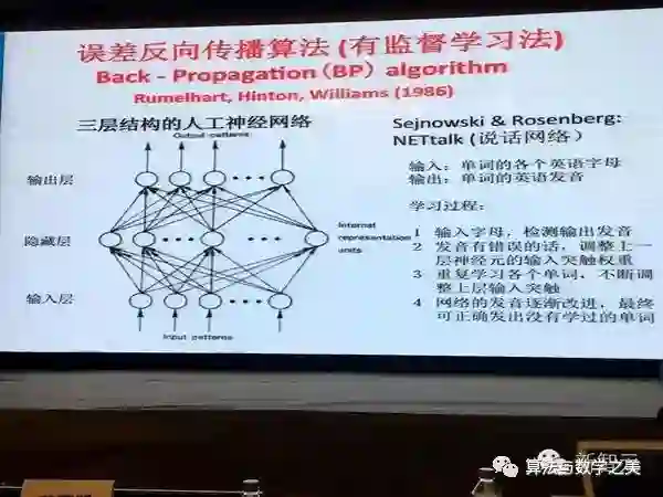 在上世纪80年代的时候,我们常常看到会说话的网络,简单的三层网络里面输入各种英文单词,然后还有输出各种发音,你就让它不断地学,其实不需要很大量的学习,网络就会记住没有见过的字,就可以出现新的发音,就开始像小孩子一样。输出不对的时候就把输入改一点,对的就不变,一层一层往上改,最后改出来的突触造成网络非常准确有效的,像这种非常令人吃惊的人工智能发展,这个在上世纪80年代末期是达到高峰,在外面的输出有变的时候,要改变输入的效率,这个就是要从输出改变输入,信息是从输入到输出这个方向,怎么把输出的信息传到输入,用数学的算法来做这不合道理,神经系统没有这个机制。
