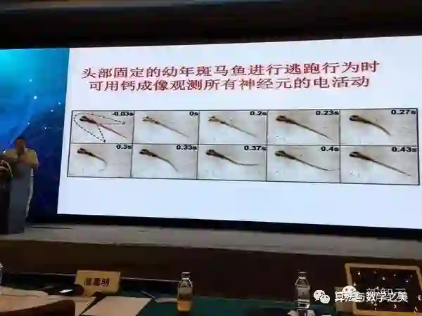 为什么不清楚?我们可以看一个简单的实验,用斑马鱼,它是透明的,所以大脑里面十万个细胞每一个神经细胞的活动都可以观察得到。把斑马鱼放到显微镜上面,头部固定,尾部还可以摆动,有各种逃跑行为,给一个闪光,尾部一动就是要逃跑,这个时候我们看固定的头部里面的活动,可以同时观察成千上万的神经原,每一次闪光出现的时候就有更多的活动。但是,没有闪光的时候也有很多活动,就自发活动,这什么意义,是鱼在思考还是在做什么,我们不知道。