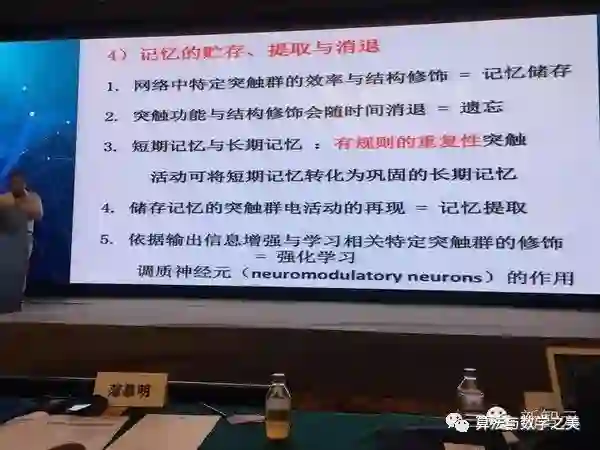 第四类,记忆储存、提取与消退。记忆是怎么回事呢,就是突触群在感知记忆或者其他记忆激活的时候之间联接增强或者结构修剪,就是在进行处理的网络上的储存,这个储存的修饰在神经系统里面随时间消退,LTP、LTD不是长期的,你来一次的话过一阵子几十分钟之后就不见了,这是有道理的,不是所有的突触都可以强化,都可以弱化的,这样子的话没有意义的信息,所以他有遗忘,这个短期记忆长期记忆是同样的网络可以进行转化,这个短期记忆就是可以消退的,有规则的重复性有意义的信息他可以把这个网络之间突触之间的强化和弱化转化为长期的变化,结构上的变化,这就是神经系统的机制,记忆储存是什么,就是在这个网络使部分突触群的活动在线,就可以把这个记忆提取出来,最后我们强化学习,通过输出信息增强或减弱来修改跟这个功能相关的突触群的修饰,通常在神经系统里面,他的指令是什么,是另外一种神经元,现在是用算法来做这个强化,但事实上神经网络里面可以加入特别的神经单元来做这个功能。