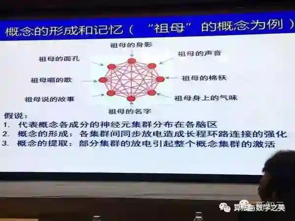 这个假说就是代表概念各个成分的细胞集群是分布在一个脑区,概念的形成过程是细胞群之间同步放电造成长程环路之间的强化。这个概念怎么产生的——看到祖母的名字就想起祖母的面孔,想起其他的东西,部分的集群的放电就引起了整个概念的放电,造成整个超级细胞群的激活。这个是一个假说,目前还没有人证实,我们也在努力研究,检测的过程需要对大量神经元电活动进行观测、进行调控,检验这个假说到底是不是正确的。